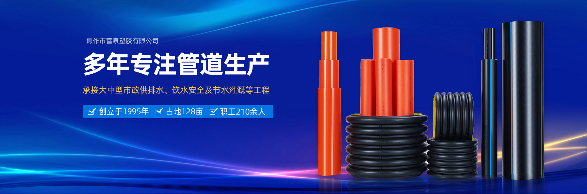焦作市富泉塑膠有限公司,創(chuàng)立于1995年,是一家集研發(fā)、設計、生產(chǎn)、銷售為一體的大型管材企業(yè)。公司位于太極故里、黃河之濱一一河南焦作溫縣。公司占地128畝,現(xiàn)有職工210余人,其中具有中技術職稱的19人。生產(chǎn)、檢驗設備58臺(套),包括PVC實壁管生產(chǎn)線11套、PE實壁管生產(chǎn)線12套、HDPE雙壁波紋管生產(chǎn)線6套、PVC雙壁波紋管生產(chǎn)線5套,檢驗設備14臺(套)。主要產(chǎn)品有:Φ20mm-630mm、各種壓力規(guī)格的PVCU、PVC-M、PE給水管材,PVC-U節(jié)水灌溉管材,HDPE燃氣和礦用管材,DN200-800mm的HDPE、PVC雙壁波紋管及各種噴灌、滴灌工程材料。承接大中型市政供排水、飲水安全及節(jié)水灌溉等工程。  富泉塑膠公司重視產(chǎn)品的質量、安全、環(huán)保和節(jié)能,在同行業(yè)中率先完成了“新華節(jié)水產(chǎn)品認證”,全方面通過ISO9001:2008國際質量管理體系、IS014001:2004環(huán)境管理體系和OHSAS18001職業(yè)健康安全管理體系的一體化導入,并建立起規(guī)范的現(xiàn)代企業(yè)管理體系。公司以“質量”為先導,采用質量跟蹤、多環(huán)節(jié)把關的方法,組建具有行業(yè)水準的企業(yè)技術檢測中心,常年委托水利部節(jié)水灌溉設備檢測中心、河南省產(chǎn)品質量監(jiān)督檢驗院對產(chǎn)品跟蹤檢測,并由中國人民保險公司承保產(chǎn)品質量。公司連續(xù)多年被河南省水利廳確定為“安全飲水設備、節(jié)水灌溉設備”定點生產(chǎn)企業(yè),并獲得“中國名優(yōu)產(chǎn)品”“質量、服務、信譽AAA企業(yè)”“河南省**產(chǎn)品”“河南省水利企業(yè)”“河南省守合同、重信用企業(yè)”等榮譽稱號。  富泉塑膠公司堅持“用戶為上”的服務理念,長期以來,全方面關注客戶價值,不斷提升服務水平。服務隊伍常年為客戶的產(chǎn)品設計、施工、安裝提供合理的方案和全程細致、周到、**、快捷的技術服務。公司自成立以來,一直堅持以人為本的宗旨,塑造企業(yè)形象,并致力于新產(chǎn)品的開發(fā),憑借雄厚的技術開發(fā)能力,先進的工藝制造流程,嚴格的質量管理保證體系,優(yōu)良的售后服務網(wǎng)絡,已成為河南省大的飲水、灌溉及排水管材設備制造商。產(chǎn)品暢銷全國,而且還以公司雄厚的綜合實力在業(yè)界中占據(jù)著重要的地位。